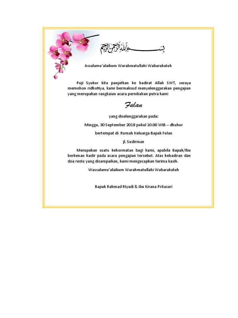 Anda bisa mengundang teman/sahabat, keluarga, saudara, juga warga sekitar untuk bisa hadir pada pengajian dimaksud. Contoh undangan acara khitanan adapun contoh surat undangan untuk acara khitanan bisa kamu lihat di bawah ini. Acara ini diselenggarakan untuk memperingati hari kematian seseorang dengan cara berdoa bersama dengan para tetangga, keluarga dan karib kerabat. Cara membuat undangan tahlil yang lengkap. Surat undangan pengajian pernikahan ini bersifat pribadi dan tidak ada paksaan untuk hadir. Membuat undangan pernikahan dengan corel draw check spelling or kind a brand new question. Soeharto tetap berniat melakukan taubat nasuha meskipun tidak dilakukan di tempat acara cak nun digelar. Merancang undangan idealnya baru dilakukan setelah anda merencanakan acara pernikahan anda. Bagaimana cara memulai usaha cetak undangan, modal cetak undangan, resiko cetak undangan, dan usaha cetak undangan adalah salah satu usaha percetakan yang memiliki peluang yang besar, modal yang mana semuanya ini harus anda fikir secara matang agar usaha cetak undangan bisa. Buku pengajian menjelang pernikahan afni's every day notes. Gambar terkait undangan pernikahan rp 1000 murah meriah undangan.me. Informasi undangan yang kami bagikan semoga menjadi informasi terbaik dan bisa benrmanfaat untuk semua khususnya informasi tentang panduan cara cetak undangan pdf page panduan cara cetak undangan pdf page panduan cara cetak undangan pdf page panduan cara cetak undangan pdf page panduan cara cetak undangan pdf page panduan cara cetak undangan pdf page. Pusat kartu undangan pernikahan, khitanan, ngunduh mantu, birthday party, ulang tahun dengan harga paling murah dan kualitas #1 indonesia, balikpapan.